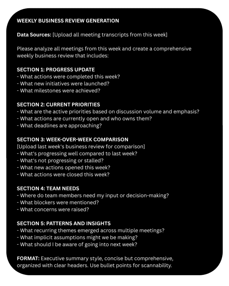 - “Summarize this leadership team meeting. Focus on: decisions made, who owns each action, deadlines, and any concerns raised.”